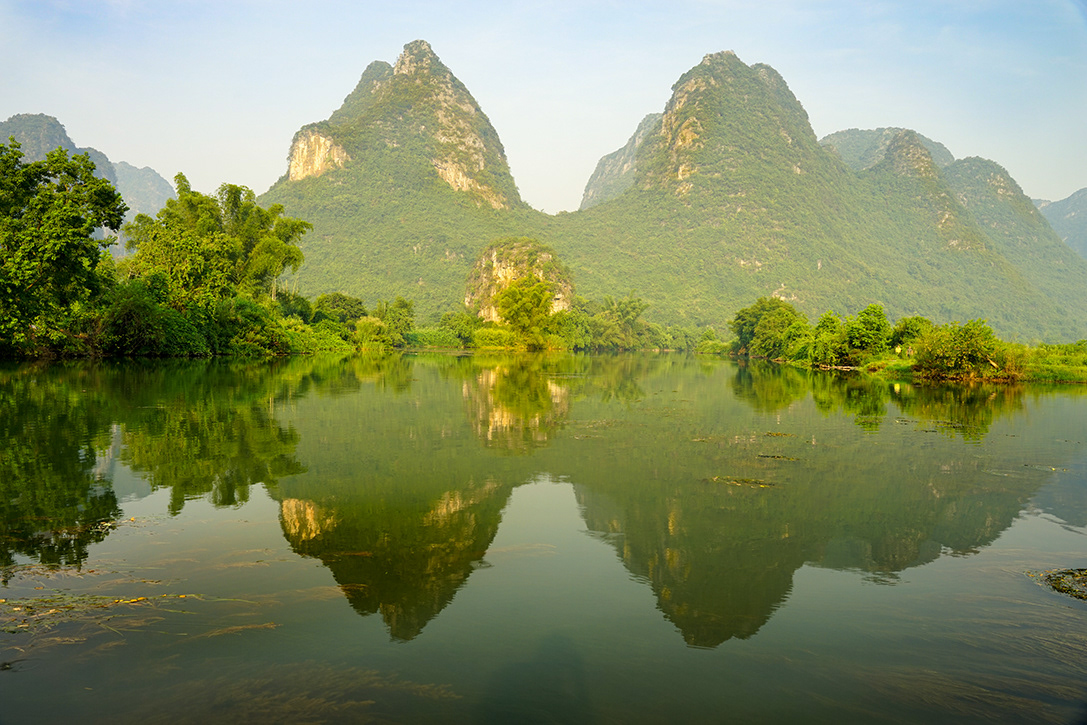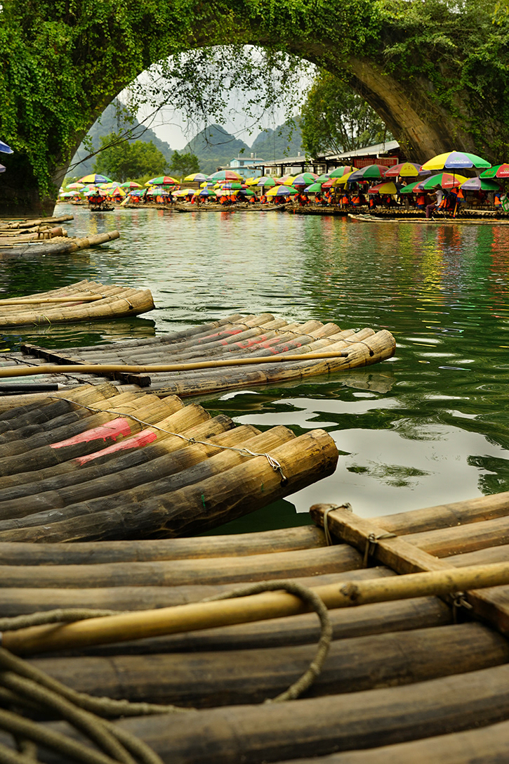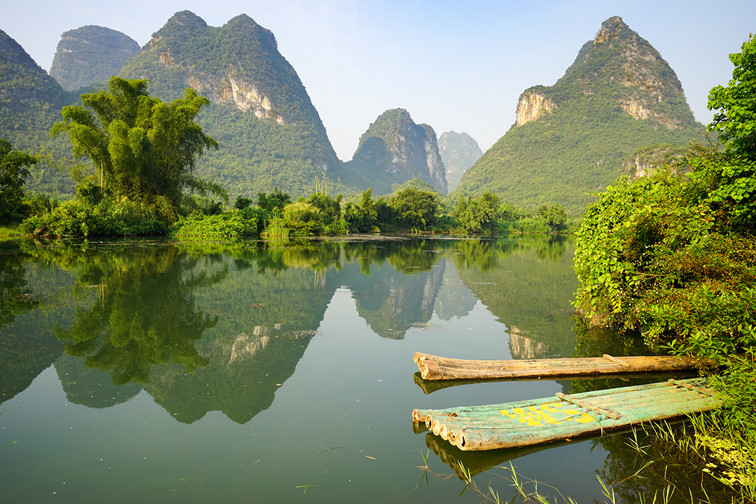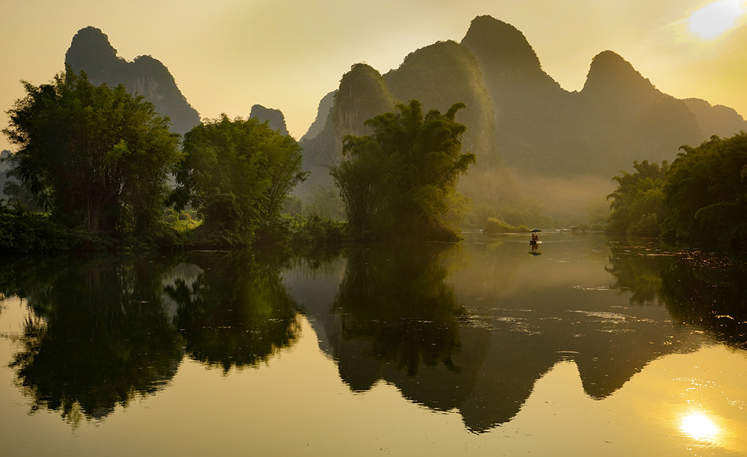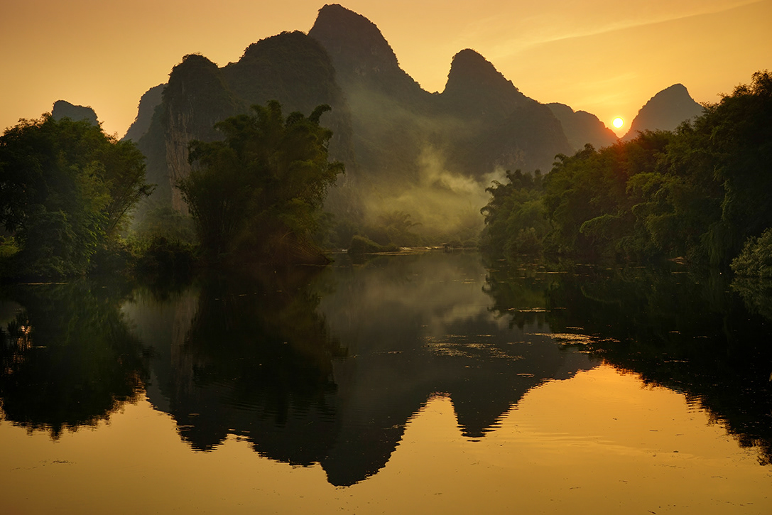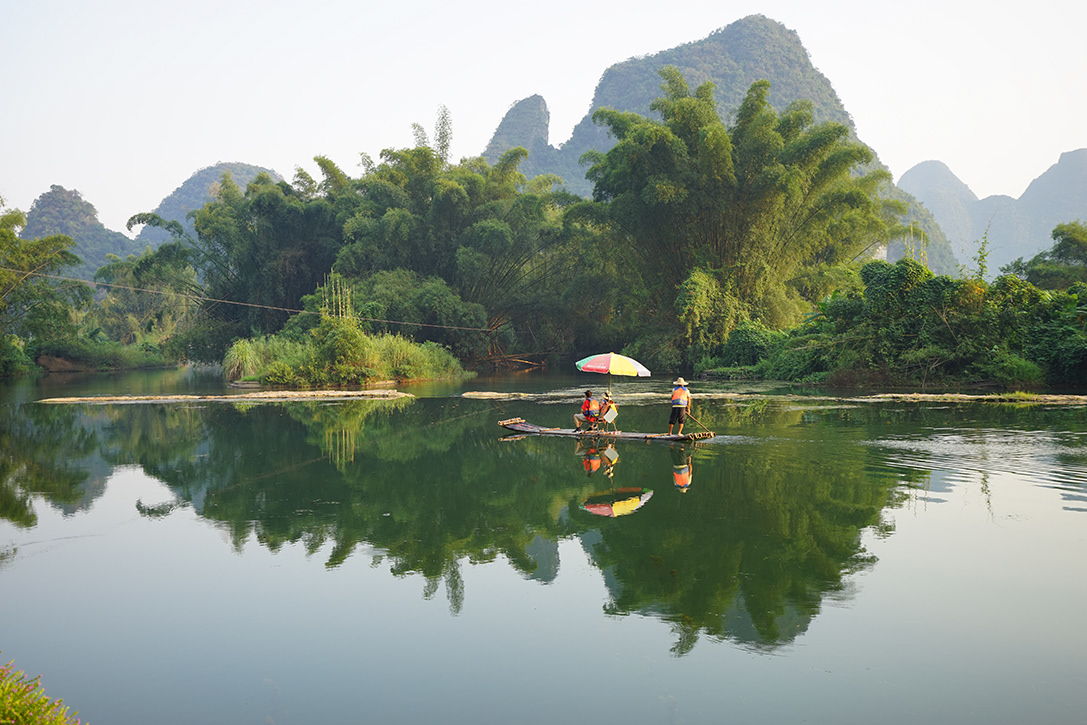 Le Yangshuo est un district de la région du Guangxi, au sud de la Chine. Il est connu pour ses sommets karstiques et spectaculaires traversé par des rivières (Lee, Yulong...) sous une brume humide.