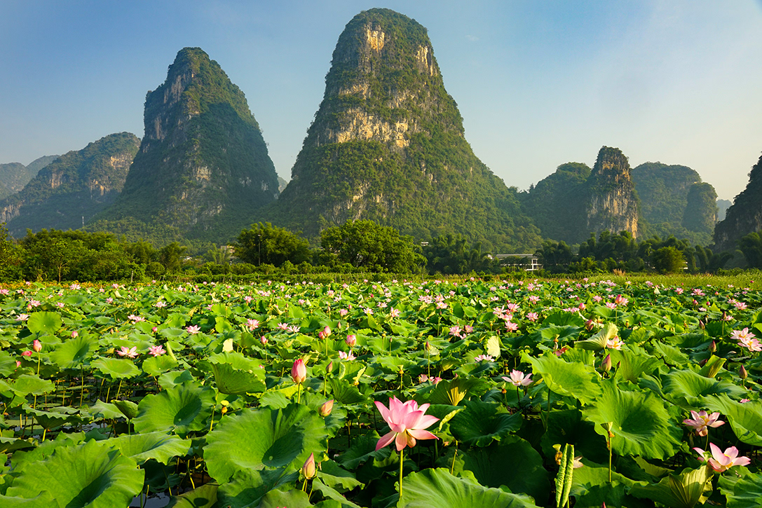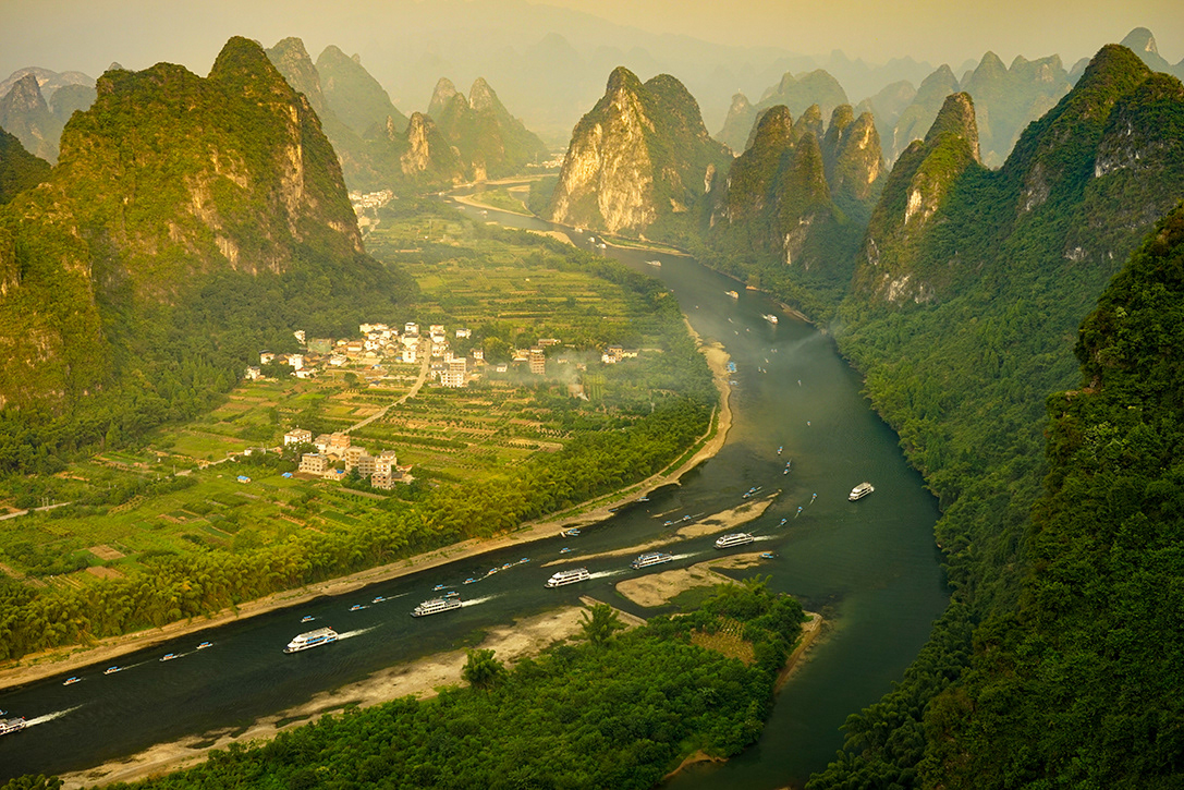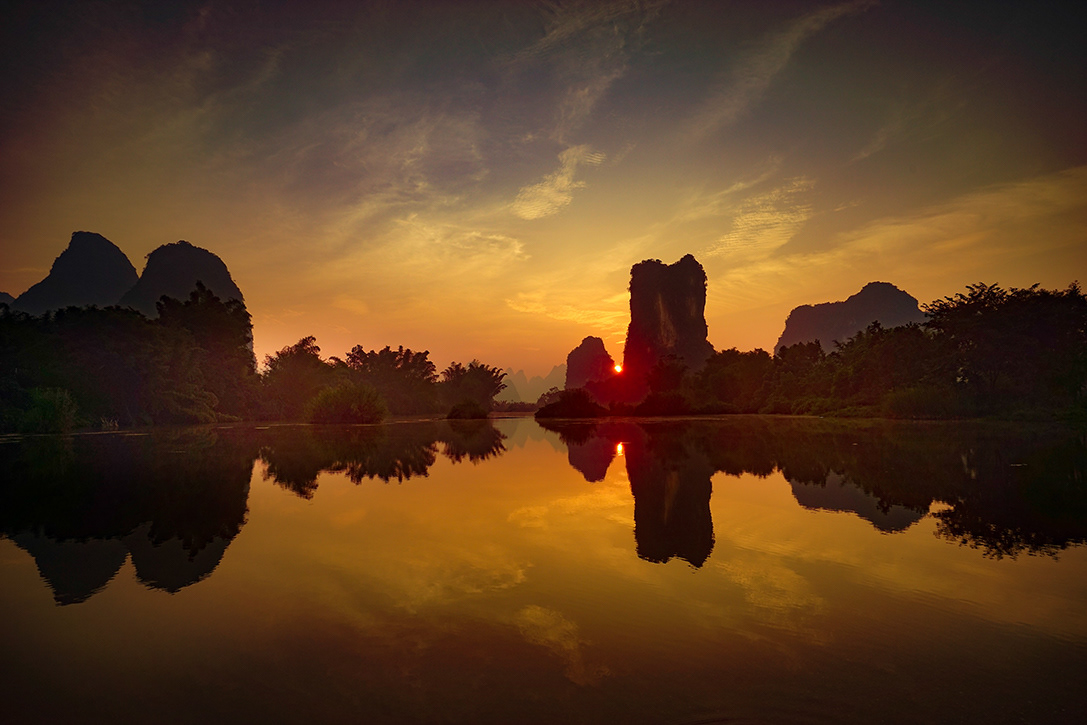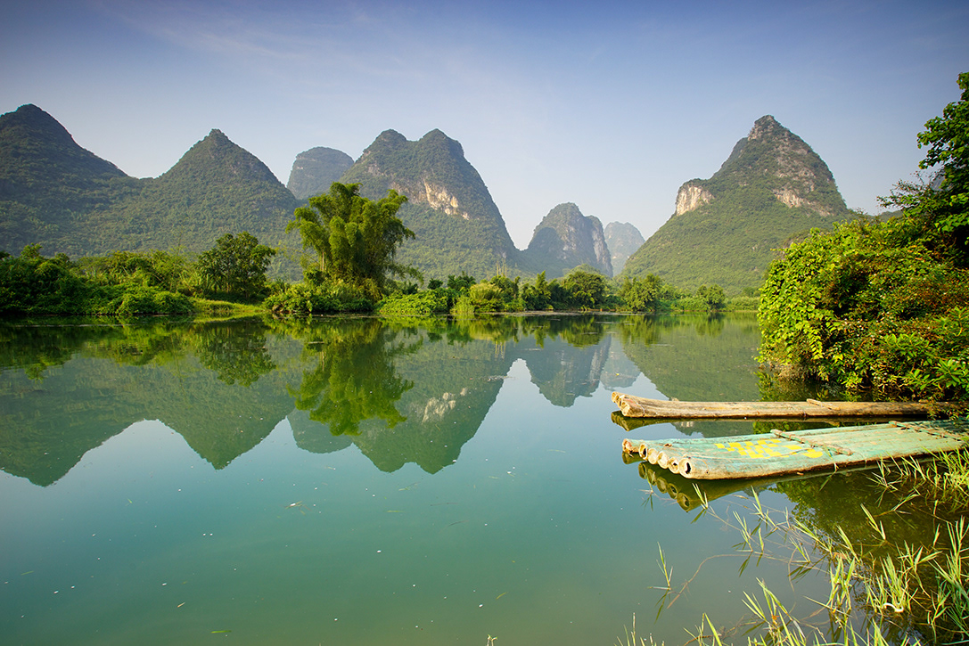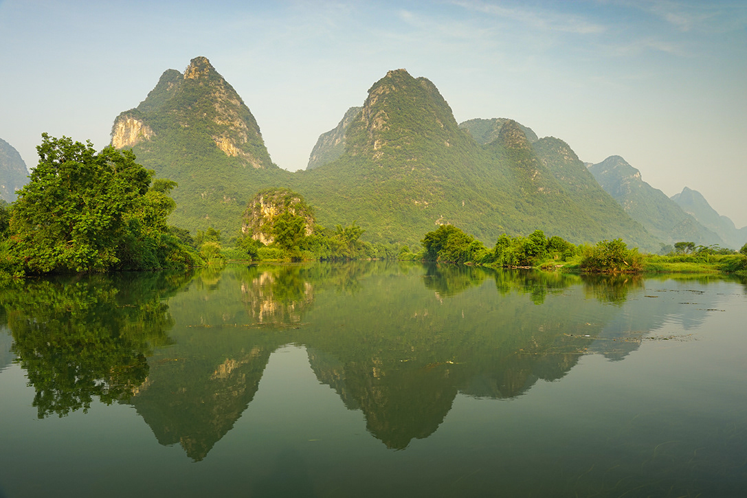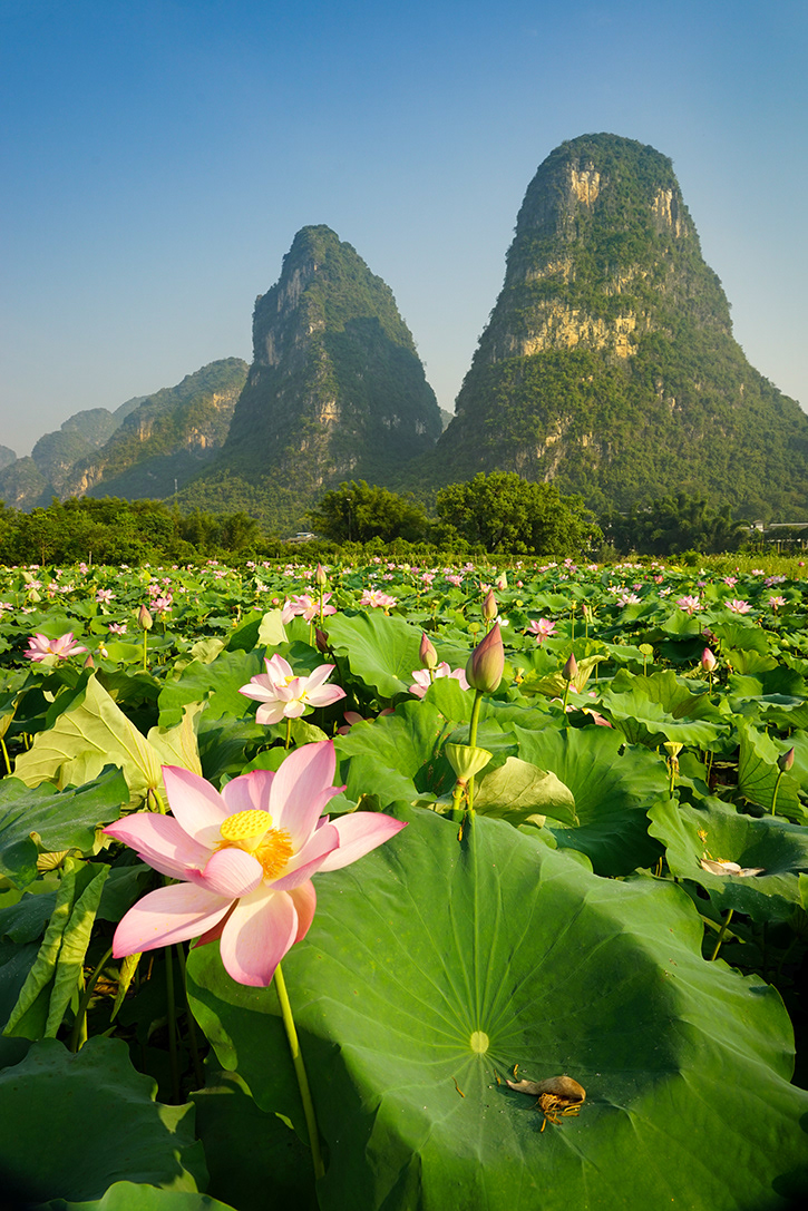 Le Yangshuo est un district de la région du Guangxi, au sud de la Chine. Il est connu pour ses sommets karstiques et spectaculaires traversé par des rivières (Lee, Yulong...) sous une brume humide.