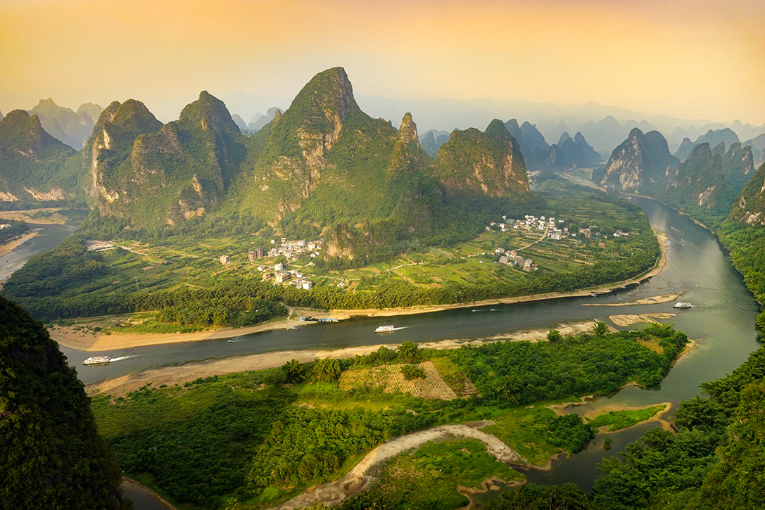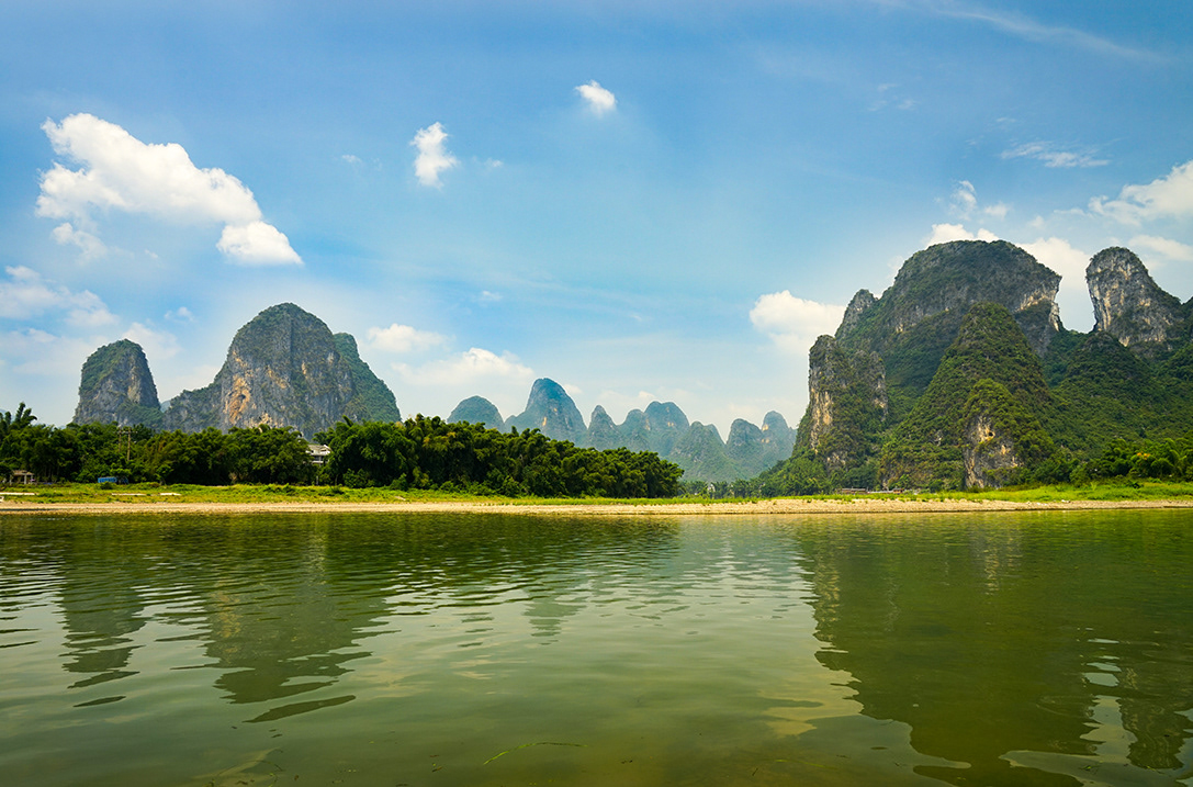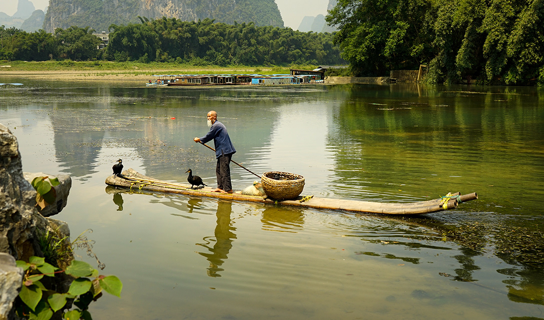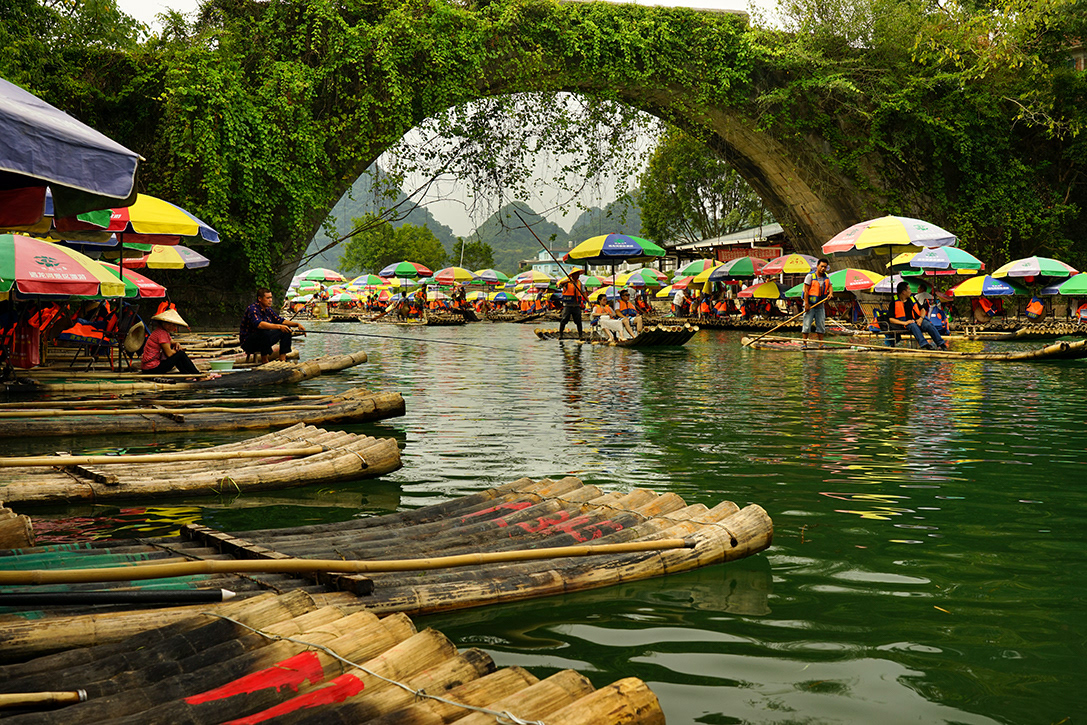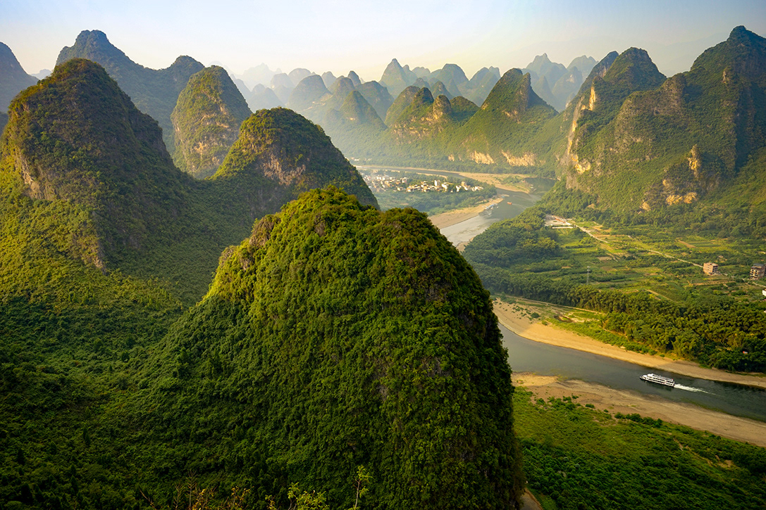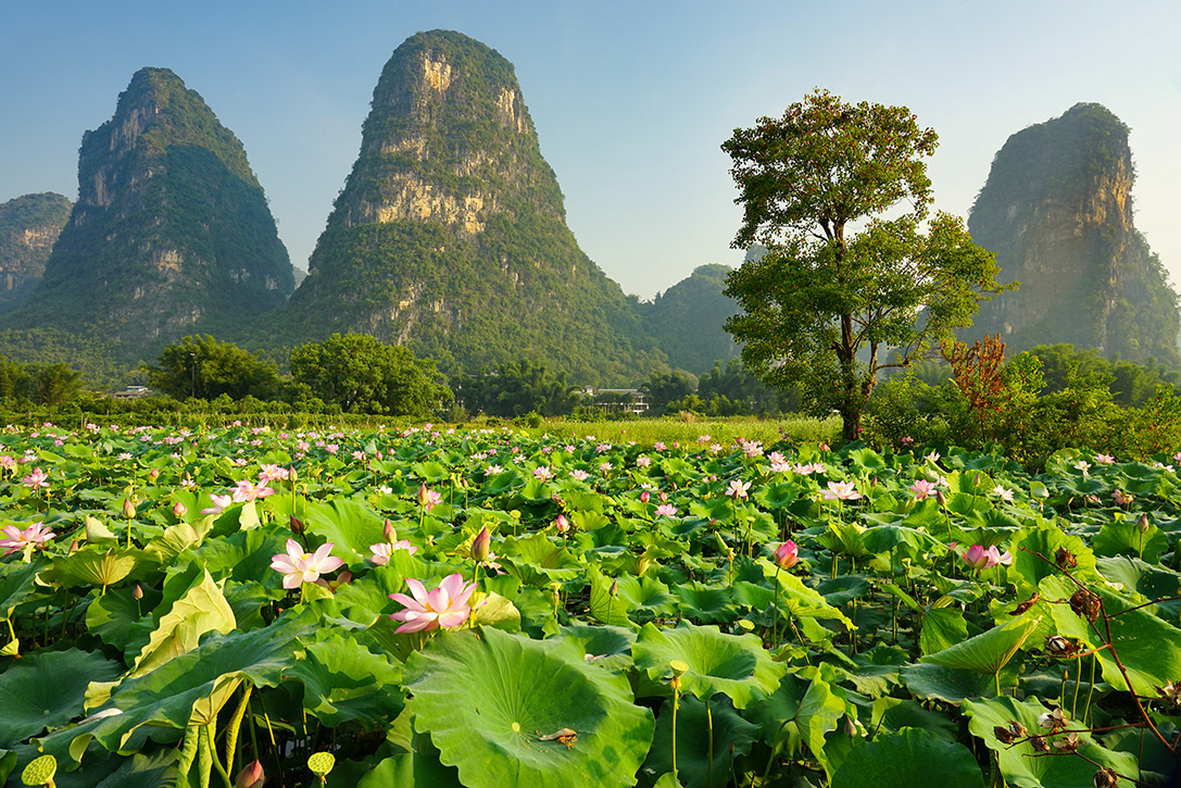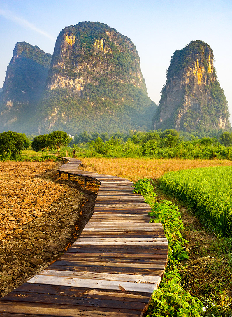 Le Yangshuo est un district de la région du Guangxi, au sud de la Chine. Il est connu pour ses sommets karstiques et spectaculaires traversé par des rivières (Lee, Yulong...) sous une brume humide.